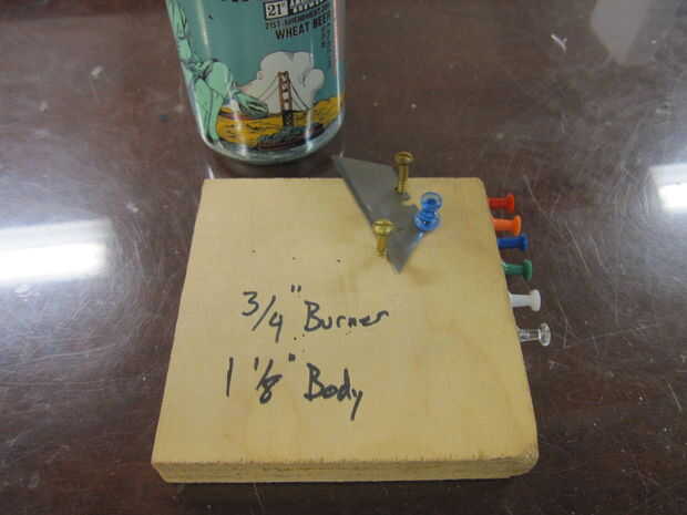 La plantilla es básicamente una hoja de afeitar que se mantuvieron en su lugar la parte superior de un bloque de madera con tornillos y pasadores de empuje. Necesita dos espesores diferentes aquí: hemos utilizado 3/4" para la parte del quemador (superior) y 1 1/8" para la parte del cuerpo (parte inferior) de la estufa. Era nuestra pieza de madera de 3/4" densamente, y tuvimos unos pedacitos delgados para poner debajo de él para conseguir más grueso para la segunda parte.