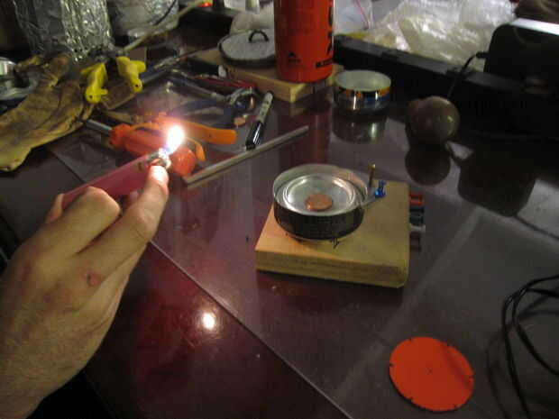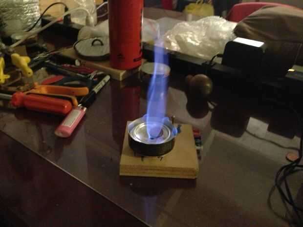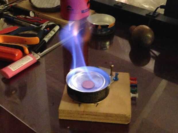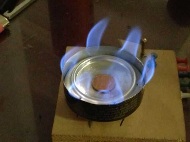 Después de preparar, los jets se enciende. La moneda actúa como válvula de presión... (también se podría utilizar un níquel que hará que las llamas ser más alto, pero la eficiencia de la estufa sufre). Periódicamente, la estufa se "eructar" el centavo para liberar la presión dentro de la estufa.