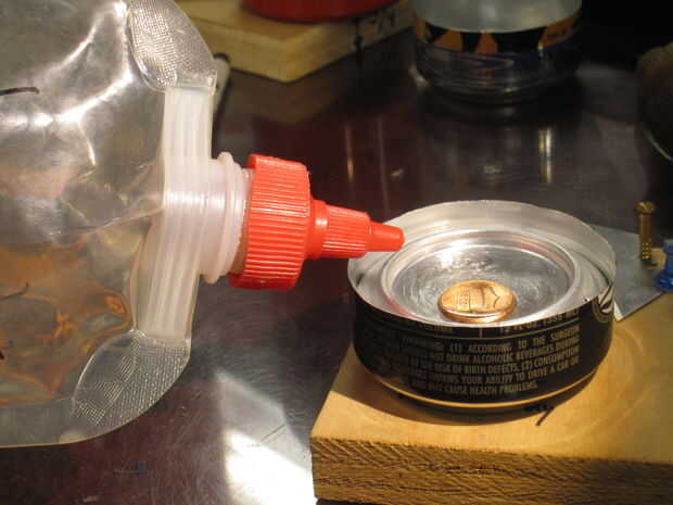 A continuación, vierta combustible a la taza pequeña formada por la parte inferior de la lata (esta área se utiliza como una medida aproximada de aquí). Empuje el centavo a un lado, que hace que el combustible caiga en la taza inferior. Dejar una pequeña cantidad de combustible en el borde exterior que se encienden a la estufa.
