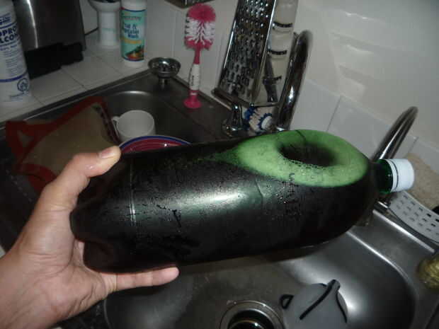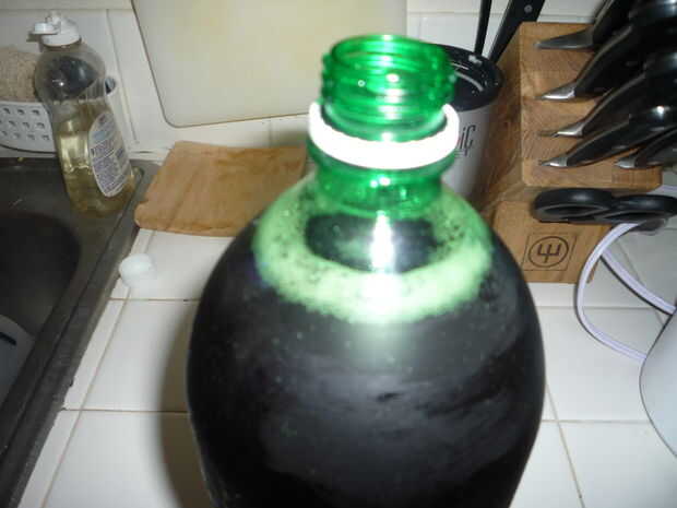 Tratar de sacarle el jugo a correr por el interior de la botella para evitar que el agua carbonatada se llena demasiado. Llene hasta la línea de 'jugo'.