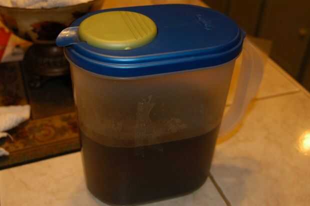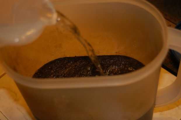 Ahora nos trasladaremos el café recién molido a la jarra de blanco. Esto es donde la almohadilla de corte flexible realmente viene en práctica. Luego, mida y vierta 8 tazas de agua fría a la jarra. Cerrar bien con la tapa, le dan unos temblores y agitación para obtener los gránulos mezclados bien con el agua, luego stash en la nevera durante 18 a 24 horas. Si usted puede, agítelo de vez en cuando mantener el agua y el café mezclado.