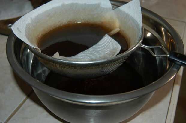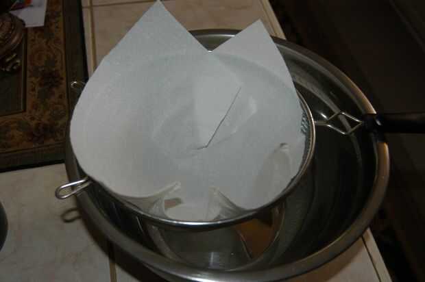 Coloque el colador sobre el tazón de fuente grande u otro recipiente de captura, línea el colador con la toalla de papel, como en las fotos, luego empezar a verter en el café. Usted puede tener que ver esto en lotes, pero no tarda mucho tiempo para conseguirlo tensas.