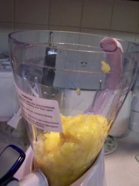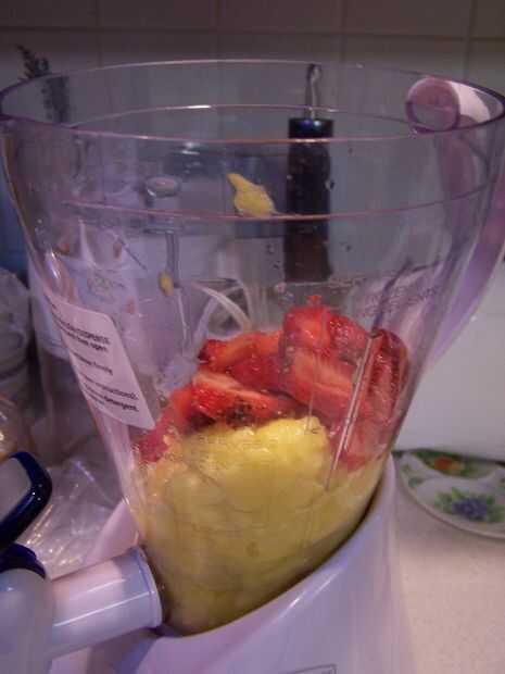 Mezcla todo juntos excepto el hielo hasta que haya una consistencia uniforme. Luego tome 5 cubos de hielo y los echan. Pulso la mezcla hasta que queden pequeños trozos de hielo.