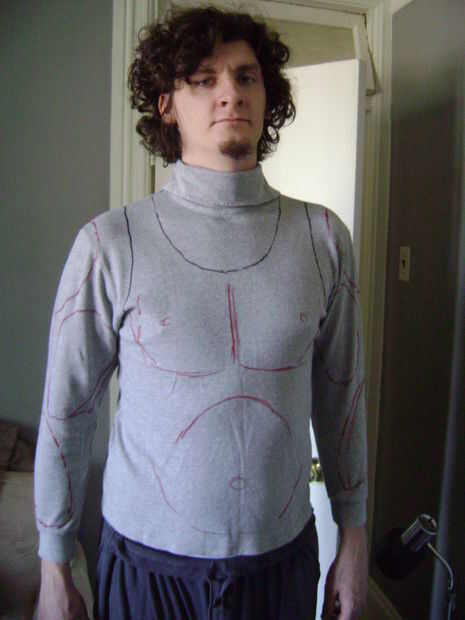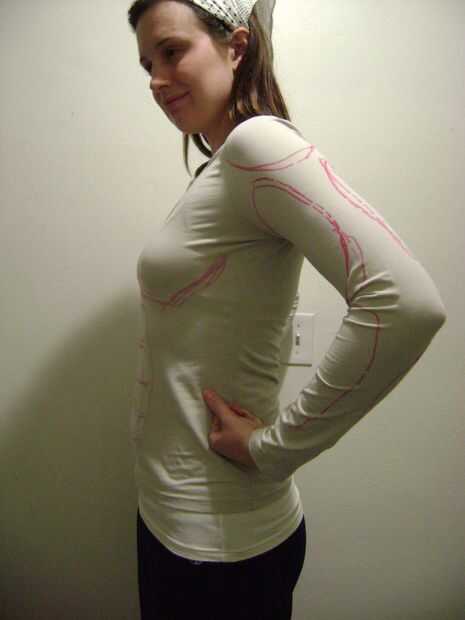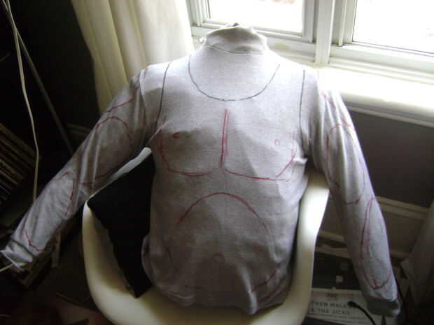 Poner en la camisa y marca donde debe estar los músculos. Poner la camisa en el maniquí y asegúrese de que se alinea recta y las marcas de los músculos que desee.