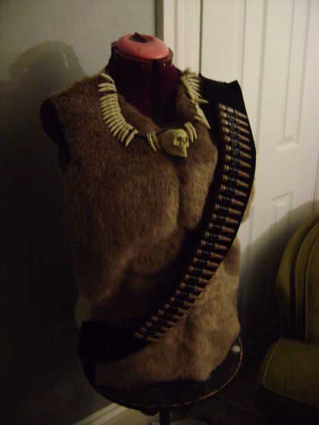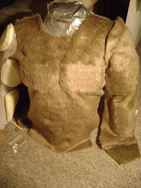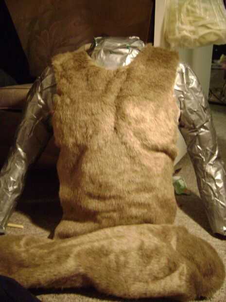 En $30 por metro, no quería desperdiciar cualquier piel falsa, usé primer retazo (una sábana vieja) para hacer un patrón de piezas para el pecho y los brazos.