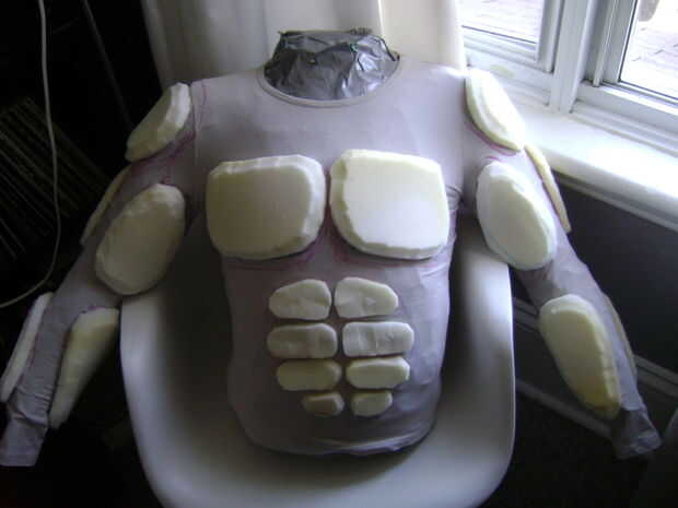 Coser alrededor de los pedazos de espuma para acentuar los músculos en el pecho y abs.