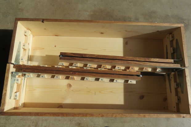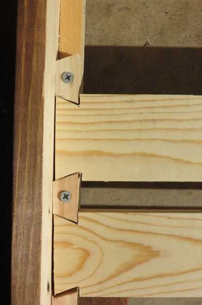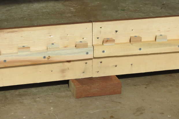 Esto es donde se pone complicado. En primer lugar, las longitudes de 1 "x 2" deben ser cortadas en longitudes correspondientes para ejecutar a lo largo de las longitudes de 10", 26,75" y 28,25". No vendría mal a todos y cada uno de estos antes de atornillarlo a los lados de la cama de ingletes. Esto permitirá a los lados abrir y cerrar sin chocar entre sí. Os adjunto estos "raíles" 3/4 "en el conjunto superior de bisagras. Intenta su mejor para mantener estos nivel entre sí (y especialmente de un lado a otro, así que no hay ninguna inclinación cuando se pone el colchón hacia abajo).