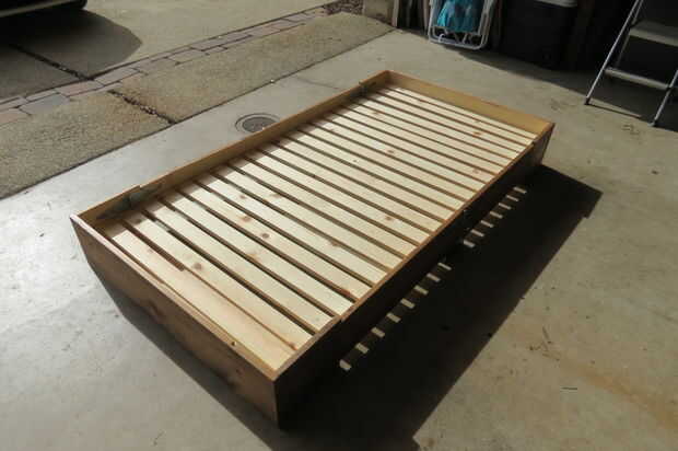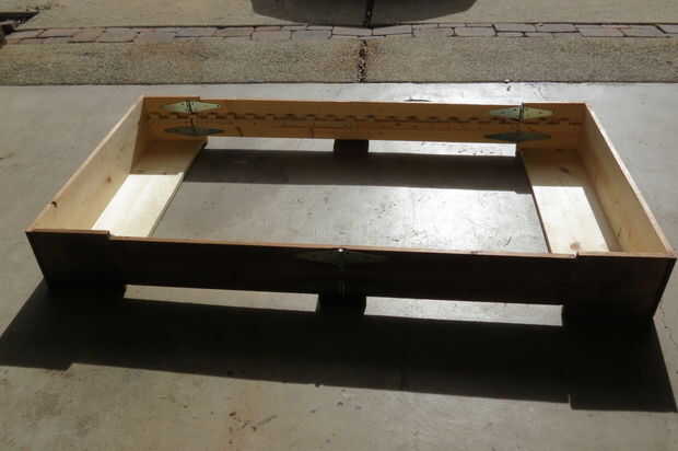 También apliqué una oscura mancha en el exterior de la caja, que le da un mucho mejor aspecto en general, tanto en las posiciones abiertas y cerradas. Dejar secar y está listo para un colchón! Los colchones tamaño twin encaja perfectamente dentro del marco, y si digo lo mismo se ve muy bien. Simple. Práctica. Hermosa. Oh sí y menos de $150.