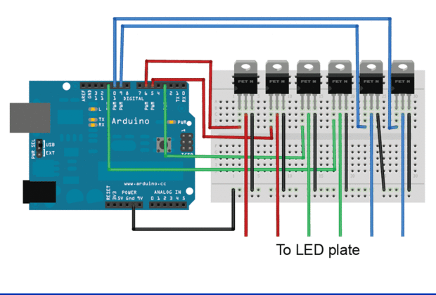 El arduino (o compatible) está conectado a los LEDs mediante FETs de canal N nivel de lógica. El diagrama muestra 2 grupos de 3 colores pero se puede cambiar fácilmente de 2 colores. Si se utilizan LEDs de color rojo, debe colocarse un 0,5 ohm, 5W led en serie con el cable a la placa de LED.