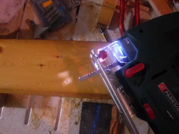OK, después de que hubo la parte de la corte. Fue divertido, pero fue un paso corto! Mis tablones de madera fueron 160cm de largo por lo que necesitaba para cortar el extra 35cm. Medida que la pared de mi habitación a hacer una especie de separador con mi pecho de cajones, pero sigue teniendo algo de espacio para moverse entre él y la cama, una longitud de 125 cm para la mesa era ideal. Puede que necesite tablones de madera más corta/larga, es la llamada! Después de cortar, recuerde que lijar los bordes para suavizarlos.