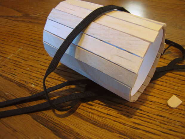 A continuación cortar los extremos varios palitos. Con pegamento caliente, les asegure verticalmente alrededor del perímetro del papel. Una vez que estos están asegurados, quite el y el cilindro debe ser robusto. Para dar algo de estilo al cañón tomar algunas cadena negro y pegamento en bandas. Divertido y útil!