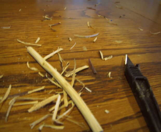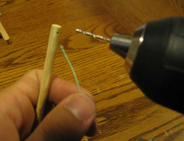 Simplemente tome un palo de cualquier árbol, en este ejemplo es madera de abedul. Yo sugeriría dejar el palo de secar durante varios días si su quitado directamente del árbol. Después de tallar de la corteza, perfore un pequeño agujero en la parte superior. A continuación tomar un hilo fino (la seda dental funcionaría también) y colócala en el poste.