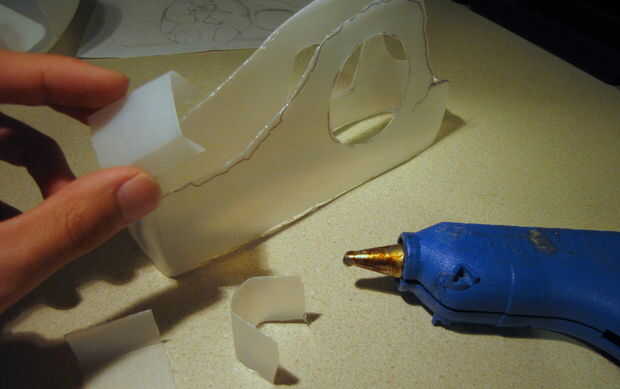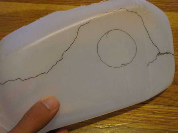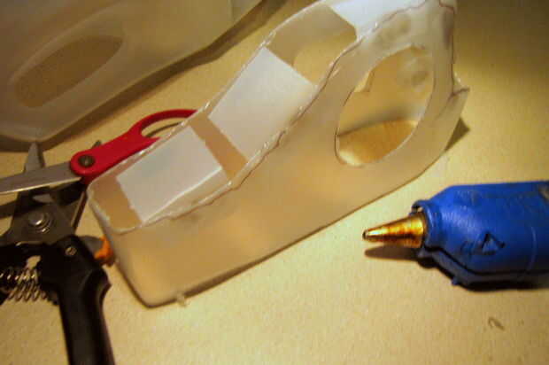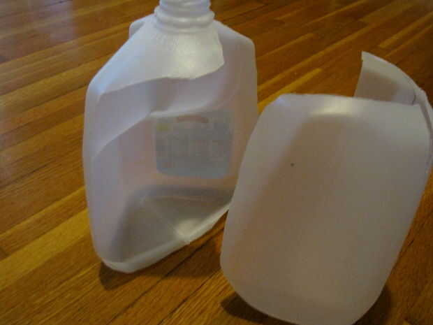 Usando una jarra de leche, tijeras y un montón de pegamento caliente, empecé a formar la estructura básica de la guarida del oso. Plástico fue más fácil de encontrar, pero como más tarde añadido, sugeriría una viga de soporte de madera por el fondo para la estabilidad. Una vez que se agrega el papel maché y el reloj, va a venir a la forma. También asegúrese de añadir en pequeñas características (golpes extras y ondas) para dar la ilusión después de grietas y rocas.