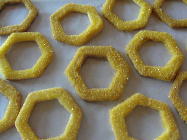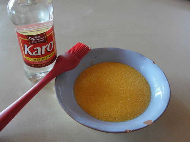 Coloque azúcar amarillo sobre un plato. Jarabe de maíz de microondas hasta que hierva. top de cepillo de 5 a 30 segundos de galleta con jarabe de maíz y sumérjalos en azúcar amarillo para cubrir. Cookies pueden ser hechas hasta dos días de anticipación y guardadas en un recipiente hermético.