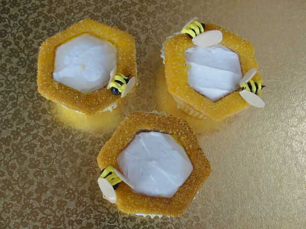 Poner glaseado amarillo y negro en bolsas Ziploc y agujero pequeño lata snip en esquina. Tubo 12 puntos negros al azar sobre las galletas. Coloque caramelos puntos. Tubo una línea zigzag amarillo frosting encima gominolas. Añadir 2 almendras fileteadas como alas. Tubería de un punto negro de betún para la cabeza y un pequeño punto tirado para stinger.