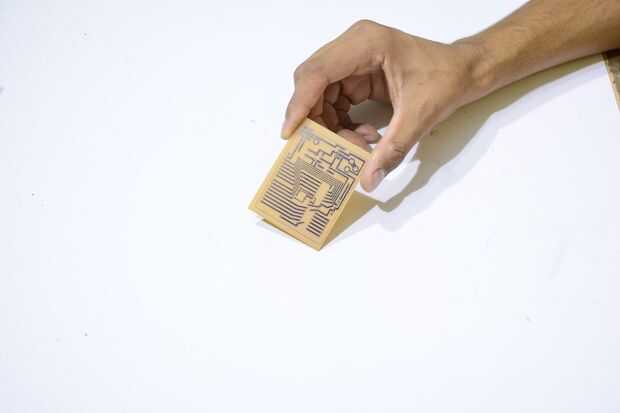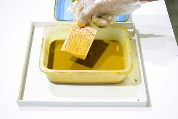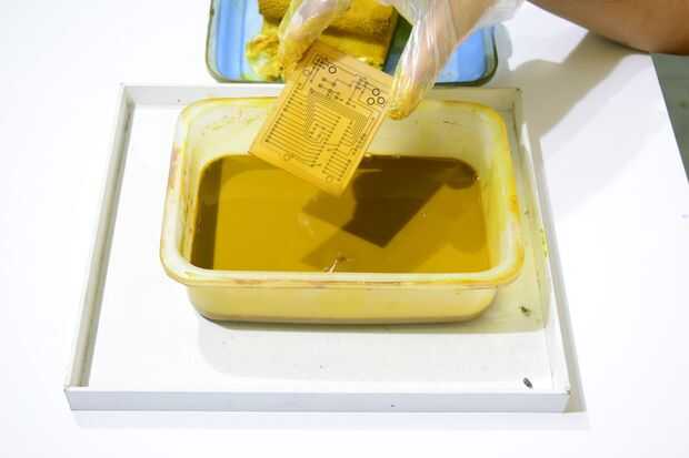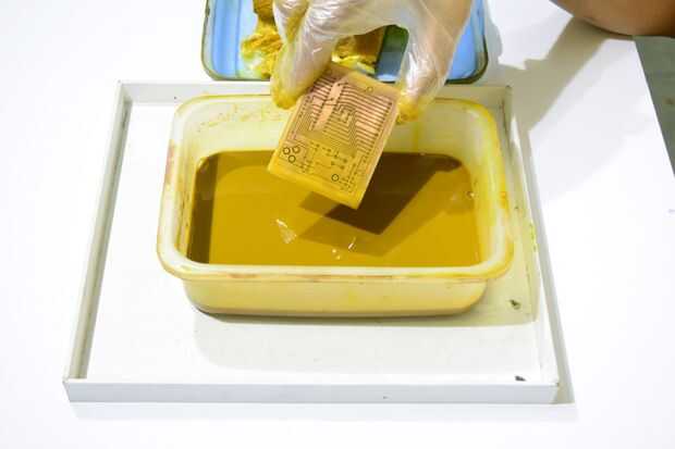 - El más común y utilizado que también fue utilizada por mi es reactivo de cloruro férrico. Su simple realidad. Colocar el reactivo líquido en una bandeja como contenedor. Si usted tiene cloruro férrico sólido luego agregue 2 tazas de agua y agregar el cloruro férrico hasta que el color es un marrón opaco mientras mezcla continuamente. Después de Coloque la placa en la solución y moverse de un lado de la bandeja hacia arriba y hacia abajo para agitar la solución. Mantener control a intervalos regulares y después de unos 5 minutos el PCB serán grabadas. Usted sabrá como todo el cobre expuesto desaparecerán y sólo los rastros negros permanecerá.