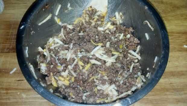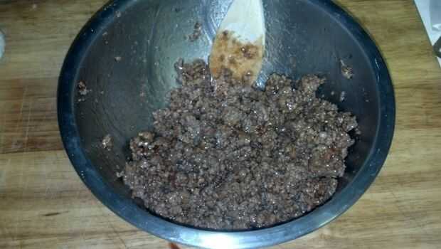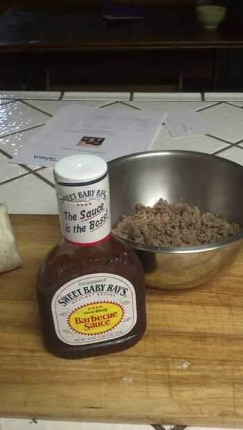 FOUND IT! parrilla para la carne molida en una sartén hasta marrón. ahora te agregue salsa de barbacoa favorita (me gusta rayos bebé dulce) y mezclar en un bol. a continuación, agregue un puñado de ole grande de queso rallado (yo usé por rallado Colby jack del wally world super Centre) y mezclar todo junto.