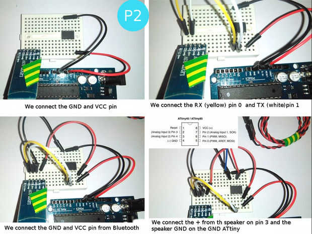 En nuestro código la RX TX de Bluetooth están conectados en la clavija Attiny45 0 et 1 y el zumbador en la clavija 2.