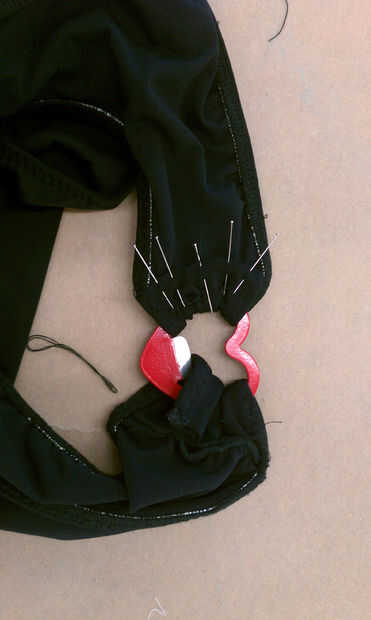 Cuadro 8) cumplí el elástico en el interior del traje por lo que el borde doblado ahora es el borde exterior del palo. Usé una puntada en zigzag desde la parte delantera de la tela para coser el borde, estirar si es necesario.