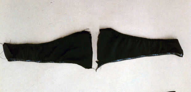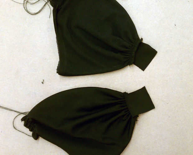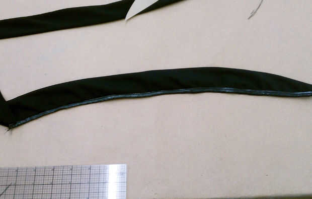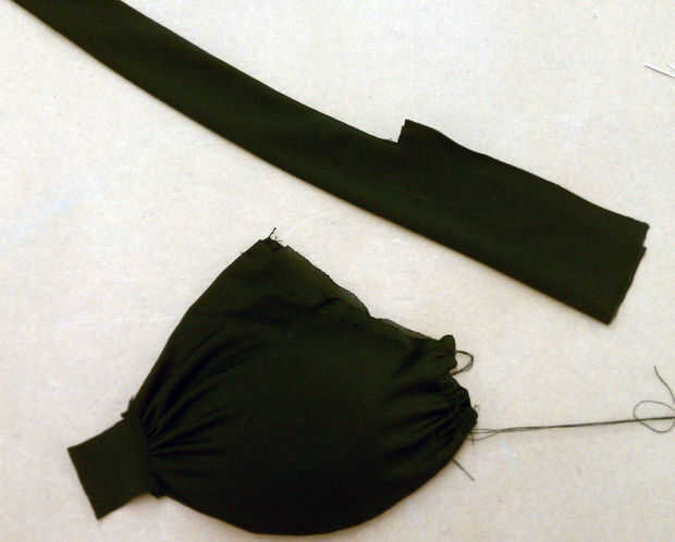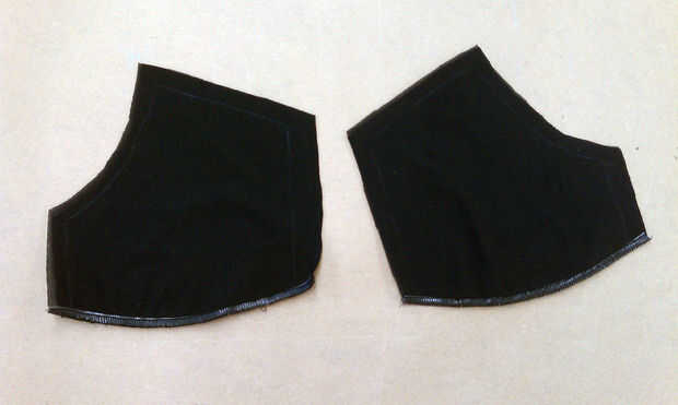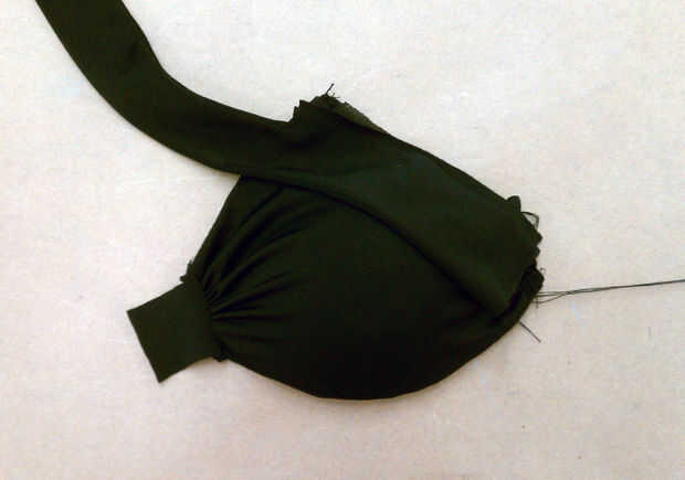 Cuadro 4) los frentes se dan vuelta hacia el lado derecho hacia fuera (encierra el elástico en el interior) y se reunieron a lo largo de los frentes del centro y los lados. Los bordes delanteros reunidos eran entonces serged chatarra piezas de lycra que se utilizará más tarde para coser en el abrelatas de botella.