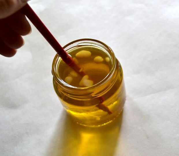 Mezclar el aceite y la cera muy bien, hasta que se derrita la cera.