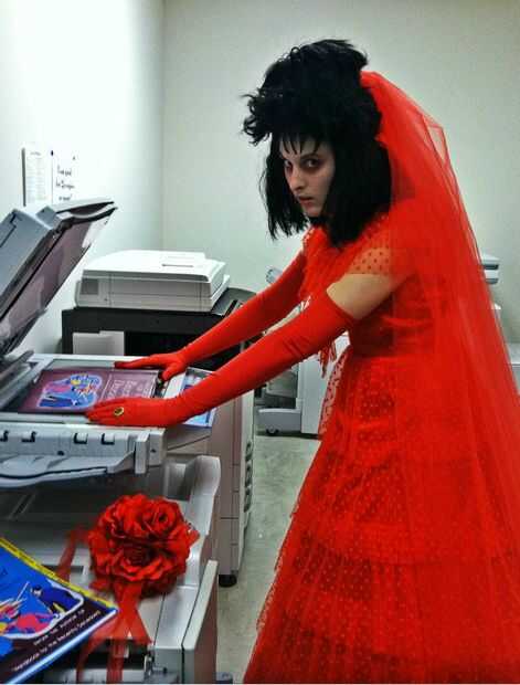 Velo: Cortar yardas de tul por la mitad o en tercios, dependiendo de cuánto de un velo te quiere (te recomiendo no mientras la mía, el velo en la película es realmente más corto que la mía y le ahorrará tener gente casi tirando su peluca apagado toda la noche). Abre la doble ancho de tul. Base a lo largo de la parte superior de la máquina. Se reúnen como apretadamente como sea posible. Ate el roscas y recorte. Pegar a un clip de la garra. Borde inferior del velo en forma redondeada.