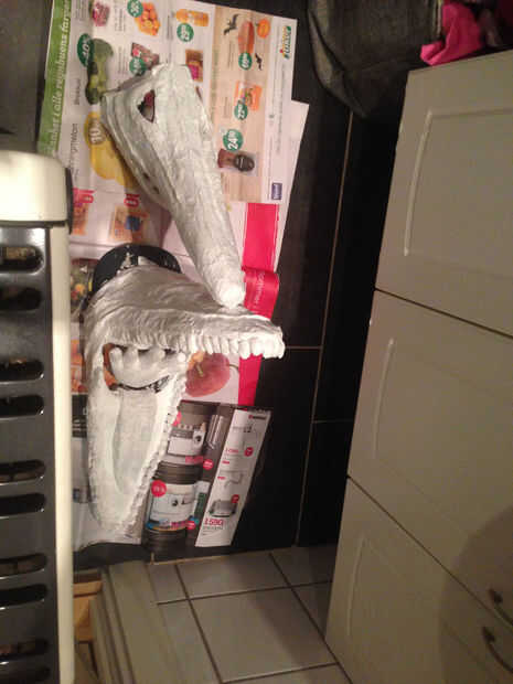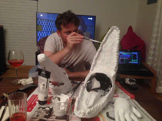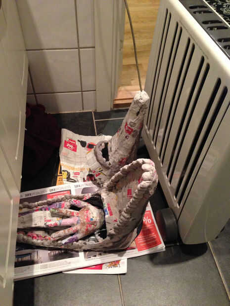 La mano es un rubberglove inflado cubierto con papel maché. Ahora todo lo dejamos secar en un lugar caliente antes de pintar todo con un acrílico blanco. Deje que la pintura seca durante un par de horas.