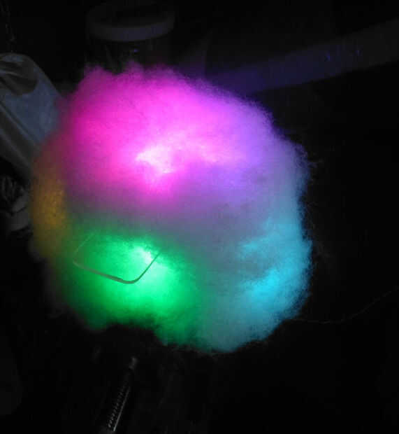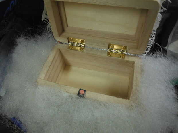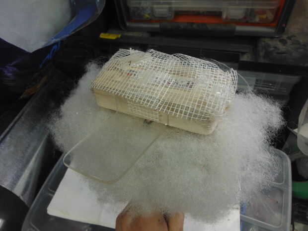 La clave para que este aspecto como una nube es eliminar ese cuadrado. Al igual que dablondeemu he utilizado adhesivo respaldado por cinta, relleno de Polly blanco relleno de malla y caliente cola. Probar en un trozo de madera antes de invertir en el producto final. Comience por cortar la cinta por la mitad, las tiras más pequeñas se ven un poco más naturales. Utilice pegamento caliente para pegar un extremo, luego hacer un arco y pegar el otro extremo hacia abajo. Asegúrese de ir en extraños ángulos y alturas; quiere disimular la caja que está utilizando. Para evitar accidentalmente sellado el cuadro cerrado, empezar con la parte inferior a la mitad, envuélvalo alrededor de la parte posterior después cubre la mitad superior. A continuación, coge una pieza de tamaño de una pelota de golf de poly-relleno y pegarlo a la cinta con una pequeña piscina de pegamento caliente y un momento de presión. Muchas pequeñas bolas de pelusa dará un mejor resultado que los grumos más grandes.