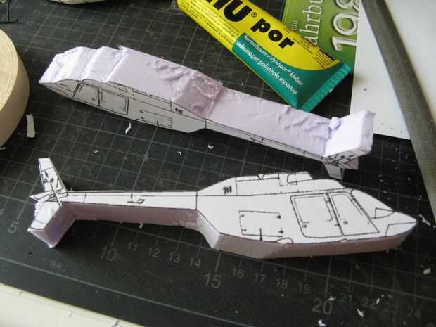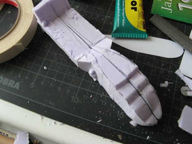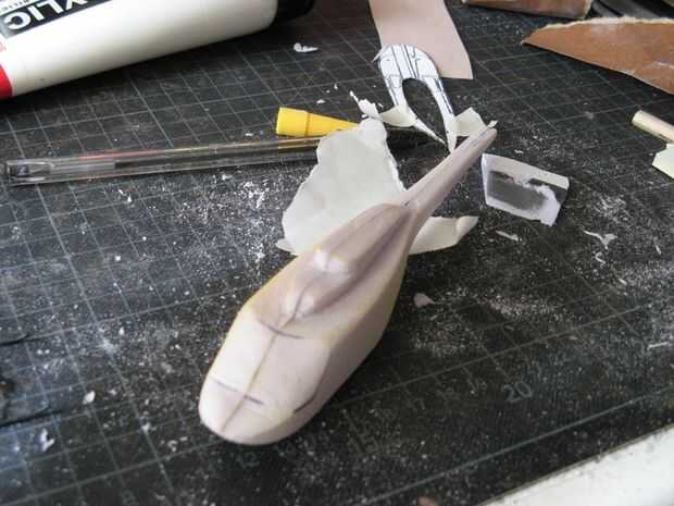 Luego se unió a las 2 mitades, las impresiones hacia el interior. Ahora empieza la diversión: utilizar un cortador de la forma general, un conjunto de warsing y luego se lija. La forma del extremo inferior de la parte posterior, entre la cabina y el tubo de cola, es muy difícil de entender desde los planos, por lo que sugiero echar un vistazo a algunas fotos de referencia en Google.