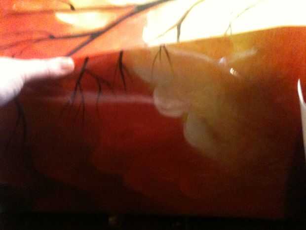 Aplicar el cemento de contacto según las instrucciones a las superficies (vierte un poco y rodado/cepillado hacia fuera) y lugar arte en tronco al que se ha secado un poco (10-20 minutos) y ejerza presión para alisar desde el centro hacia fuera y los dos juntos en un vínculo sólido.