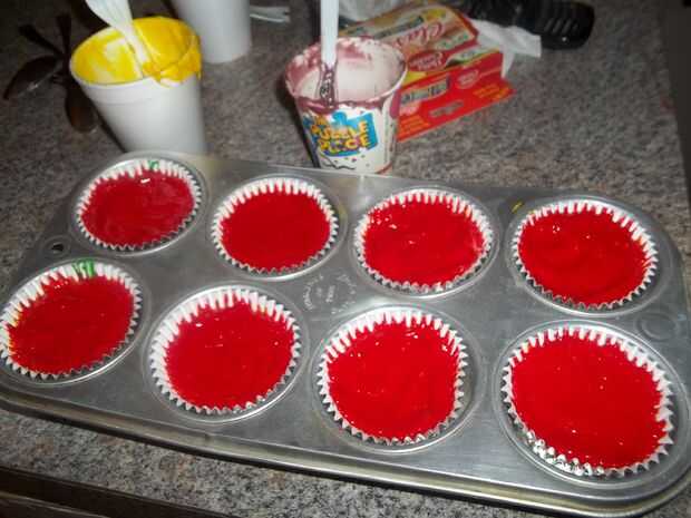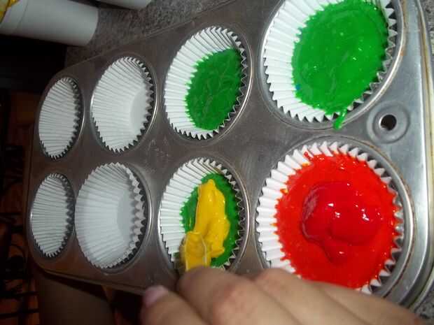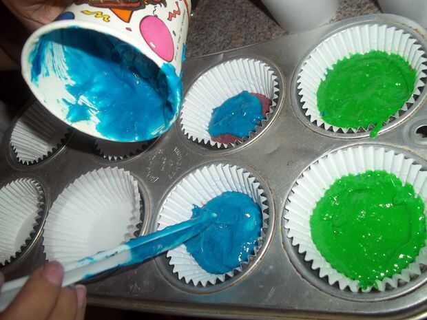 Poner un pequeño amoun de cada mezcla en cada torta de la taza. Recuerda que una capa delgada en la voluntad expan, en fin 3/4 de la Magdalena de papel.