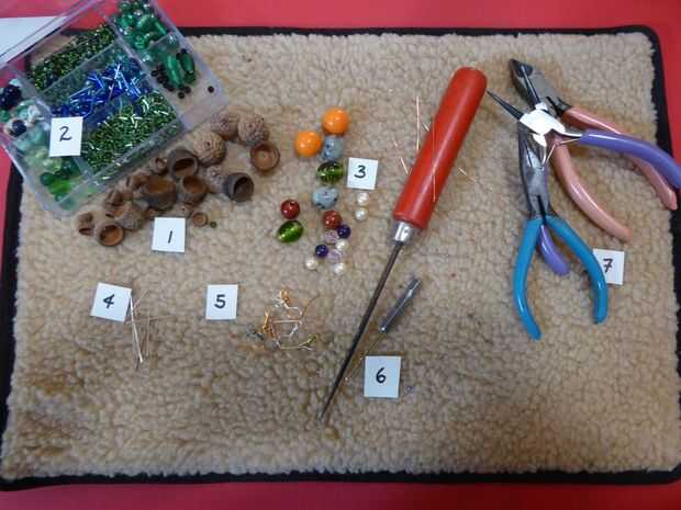 Cuadro 1 muestra todos los elementos que necesita. Los elementos más importantes son las tapas de la bellota. Si recoges los verde el centro saldrá como se secan. Esto podría ser el momento equivocado del año encontrar bellotas, pero generalmente hay algunos debajo de árboles de roble durante todo el año. No te preocupes el tamaño porque cualquier tamaño funciona y probablemente tendrá que probar diferentes tamaños para que coincida con el grano que usted elija.