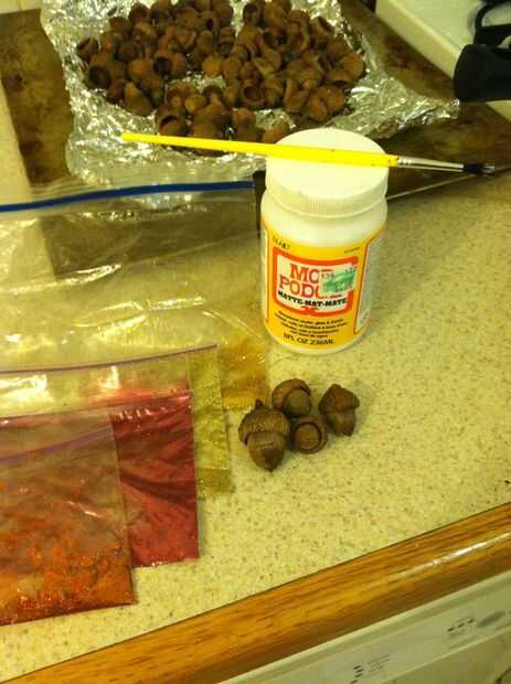 Paso 1: materia. Todo lo que necesitas es:BellotasBrilloPincelPegamento ModpodgePedazo de papelPaso 2: Hacer las bellotas Para hacer las bellotas, simplemente pinte el pegamento en la parte inferior de la bellota. Espolvoree la escarcha y utilizar el