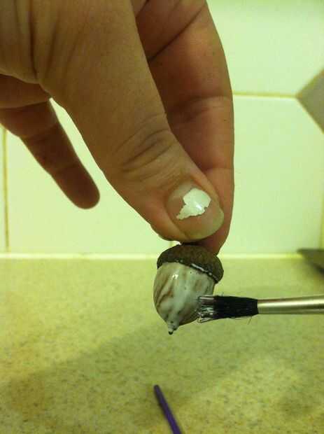 Paso 1: materia. Todo lo que necesitas es:BellotasBrilloPincelPegamento ModpodgePedazo de papelPaso 2: Hacer las bellotas Para hacer las bellotas, simplemente pinte el pegamento en la parte inferior de la bellota. Espolvoree la escarcha y utilizar el