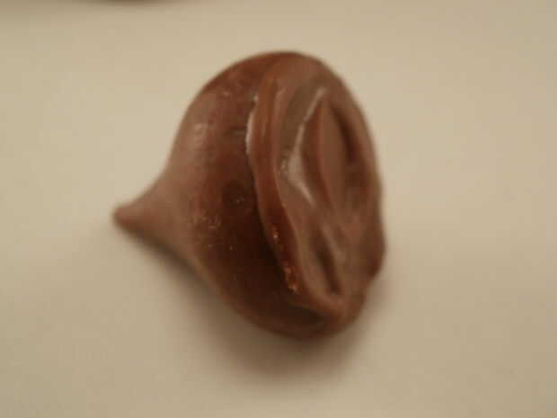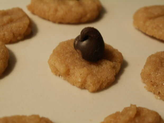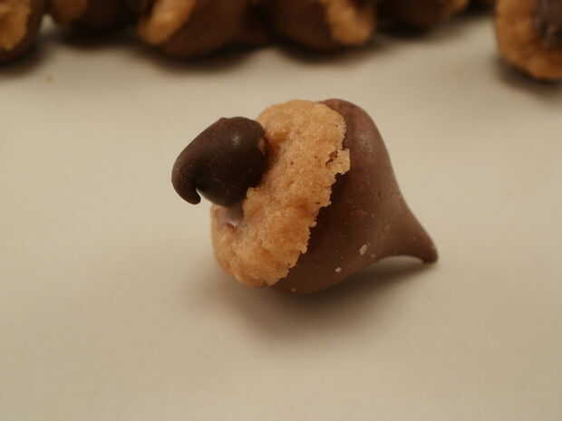 Una vez seco, sin envolver los besos de hershey y me aplican la corteza de la almendra a la kiss de hershey. Luego até el kiss de hershey a la parte inferior de la galleta. Sólo una nota, ver cuántas almendras corteza se aplica porque el beso se deslice fuera de la cookie. Tuve que volver atrás y ajustar algunos antes de que seca. Deje que la corteza de la almendra seca y mi Chocolate bellotas estaban listos para la bandeja de galletas.
