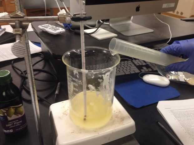 Darle peso a cada uno de sus grasas y aceites, luego ponen en el vaso y calientan hasta que estén todo derretido y entre la temperatura de 45-54 grados centígrados. Asegúrese de mantener la mezcla grasa.