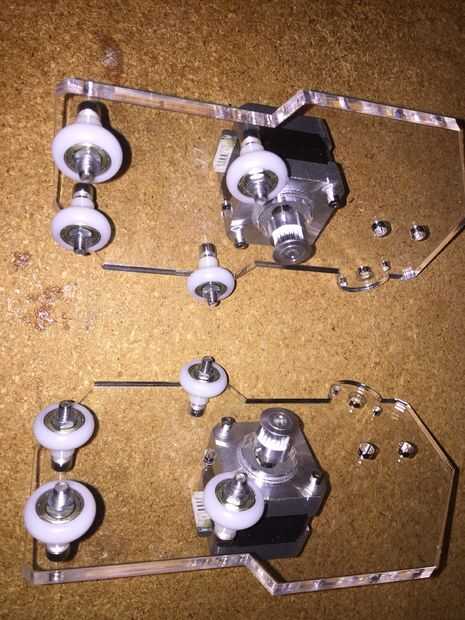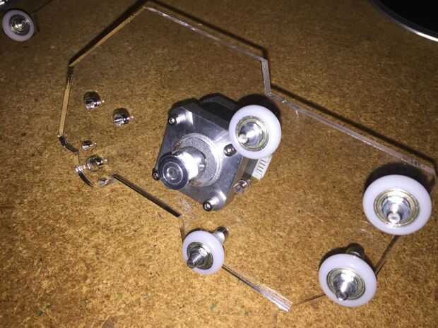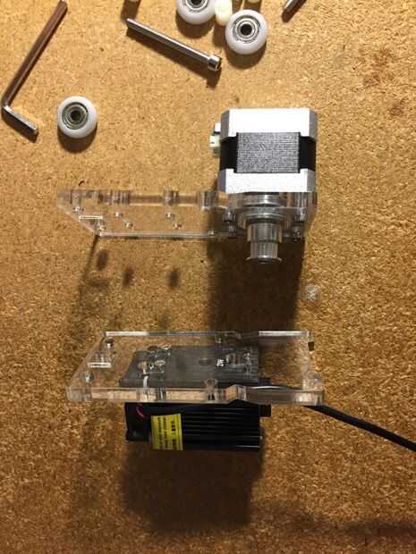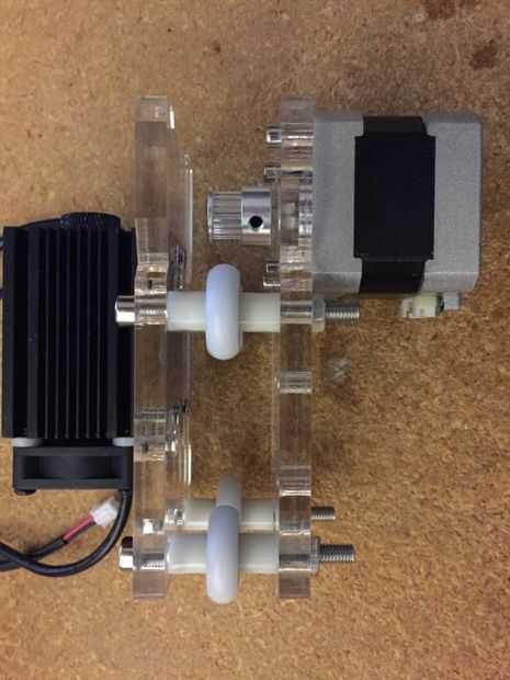 Conecte el láser y el paso a paso con la marcha a las piezas de acrílico antes de montar los tornillos largos y rodamientos (Foto 3 y 4)