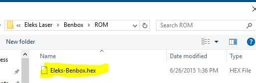 5. Haga clic en Elegir Firmware y desplácese hasta el directorio Eleks Laser\Benbox\ROM y seleccione el archivo Eleks-Benbox.hex y haga clic en el botón OK (marca de verificación azul caja)