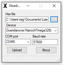 c. ejecutar XLoader y seleccione el archivo hexadecimal Nano LX, puerto COM para su Nano(AT328), 57600 baudios (foto)