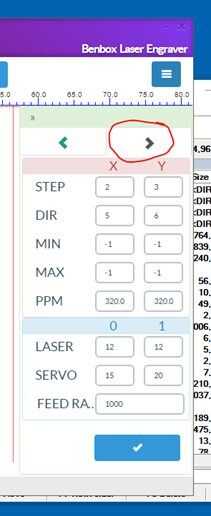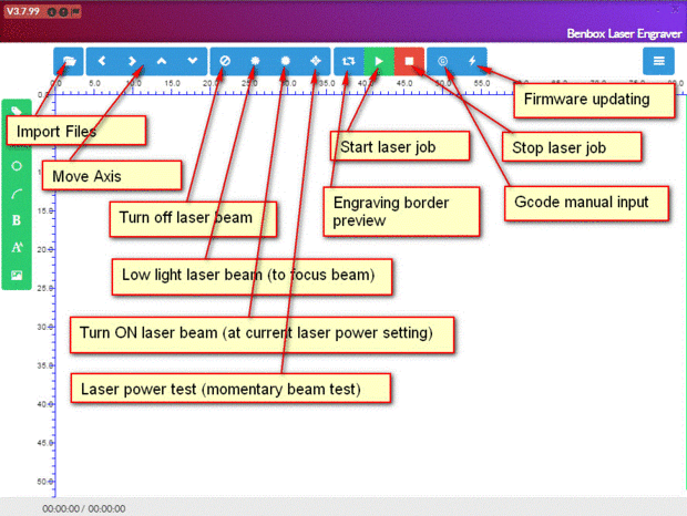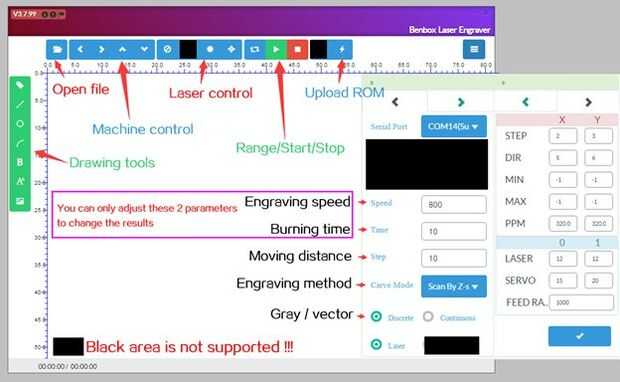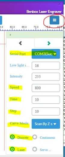 1. tenga en cuenta que algunos comandos no están disponibles (se desmayó en la captura de pantalla). Específicamente, la intensidad de láser no es cochera. Siempre es Max. Usar velocidad de grabado y el tiempo de quema para control.