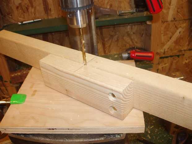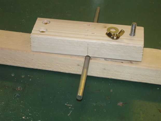 El freno de Prony para nuestro dinamómetro está hecho de madera de 2 x 3 que se sujeta alrededor de un eje de acero de 3/8". El brazo de palanca principal es 28" de largo, la abrazadera (parte superior) es 6" de largo. El brazo de palanca es simétrico alrededor del eje de modo que es equilibrado. La pieza de sujeción se lleva a cabo libremente por dos tornillos para madera en un extremo; en el otro extremo es un perno de carruaje de 3/8 y tuerca de mariposa que se utiliza para ajustar la fuerza de sujeción. Fijar las dos piezas y taladre un orificio de 5/16" en el centro exacto.