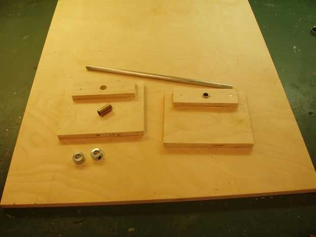 Las piezas se especifican en los pasos, pero usted puede hacer ajustes a sus necesidades. Básicamente, usted necesitará un eje y los cojinetes. Un eje más grande (1/2" diámetro) estaría bien, pero no use un eje menor que 3/8" de diámetro. Rodamientos de buje de bronce están bien si mantenerlos engrasado. Todo lo demás en el proyecto es madera contrachapada y los sujetadores. Todo el hardware está disponible en una ferretería.