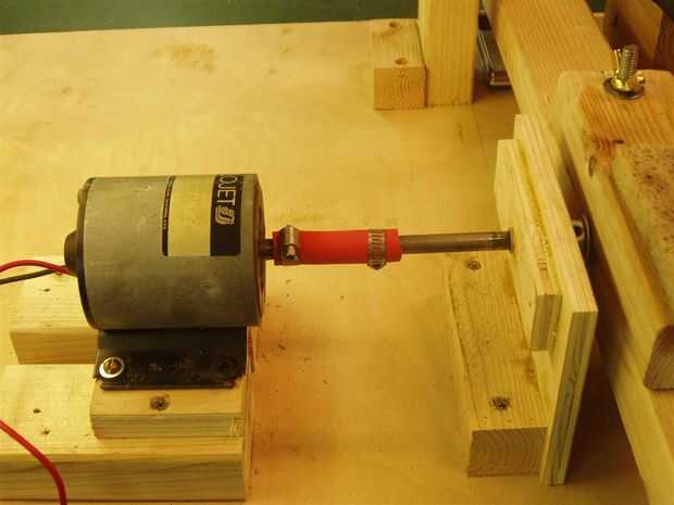 Ya que se probará varios motores de tamaño, la base debe acomodar diferentes eje altura. El eje de acero en la foto es exactamente 4" sobre la base de madera contrachapada. Así que para montar este motor de corriente continua que tiene una altura de eje de 2 1/2", una madera vertical está construida para traer los dos ejes a la misma altura. Alinee los ejes con un borde recto. El eje del acoplamiento en la foto es cierto improvisado pero funciona sorprendentemente bien. Este acoplamiento es una pieza de 3/8" manguera de aire comprimido del ID, fijada sobre el eje con las abrazaderas de manguera.