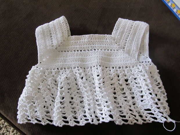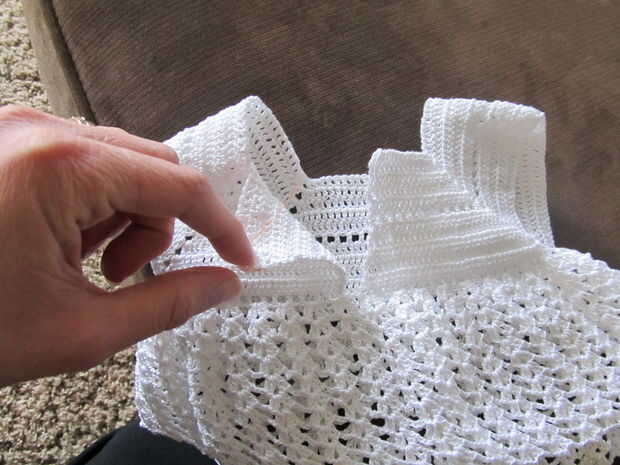 El patrón de manga original es demasiado llamativo para mi, por lo que limpió a ser más simple. Seguir el patrón (se verá como su vestido es una tapa del tanque como se muestra en las fotos), pero omite la parte de "Manga" separada del patrón. Cuando terminé el vestido, volví a la parte superior de la blusa y había añadido unas filas más similares de la blusa. Saltar puntadas para su manga Haz un poco más pequeños en el extremo.