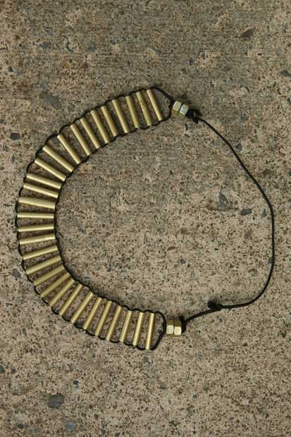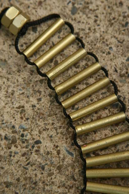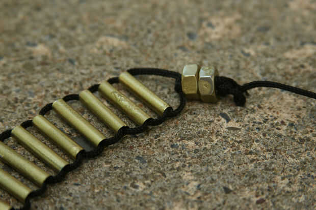 Un nudo donde termina la paja a cada lado del collar. Agregue las tuercas hexagonales y atar otro nudo. Spray pintado mina oro para ir con el resto del look. Y por último la parte superior del collar del nudo. Recorte cualquier exceso de cordel y sellar nudos deshilachados con superglue. Por desgracia, mi nudo final no fue exactamente centrada en el puesto que me quedo sin cadena, pero con un pequeño retoque, puedo intentar ocultarlo!
