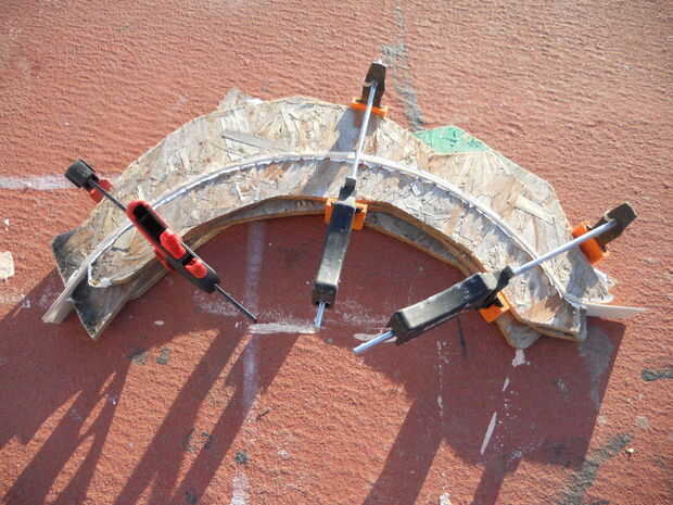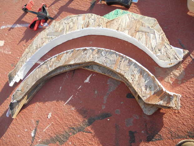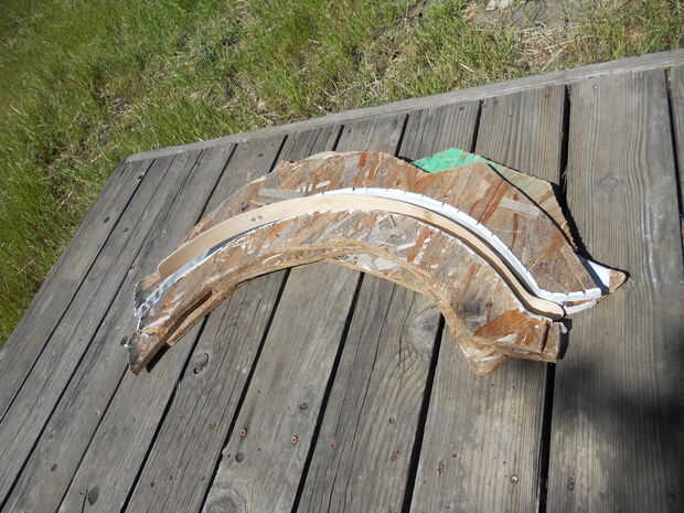 Una vez que el de 1.5" de espesor OSB oval bloque está secado, corta a lo largo de la línea de lápiz con mi rompecabezas, teniendo cuidado de hacer un arco limpio y suave. En este punto tuve el encofrado que ves en las fotos. He añadido un par de tiras de cinta adhesiva en el interior borde del encofrado para suavizar un poco la sujeción.