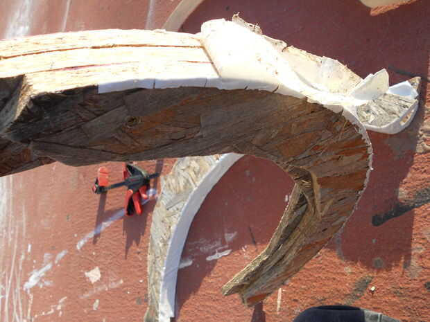 Ahora usando una sierra de calar, cortar un gran óvalo oblongo desordenado alrededor del arco trazado, offset 3 o 4 pulgadas de cada lado de la línea (ver imágenes para referencia). Esto era un paso necesario para permitir el tamaño limitado de mis pinzas de madera. Luego cortar dos óvalos más de ásperos y pegado las piezas del árbol para obtener el espesor que necesitaba para el encofrado.