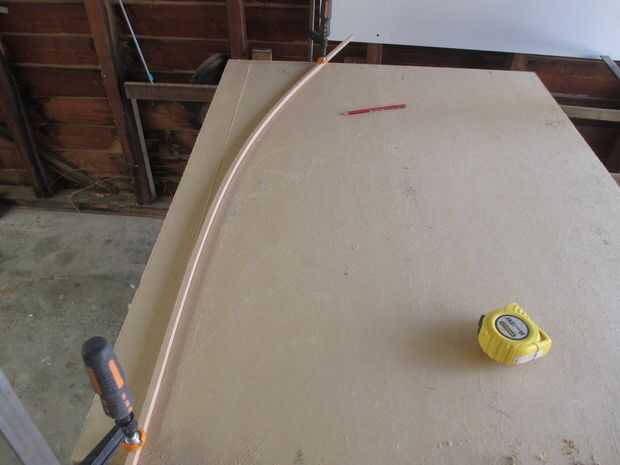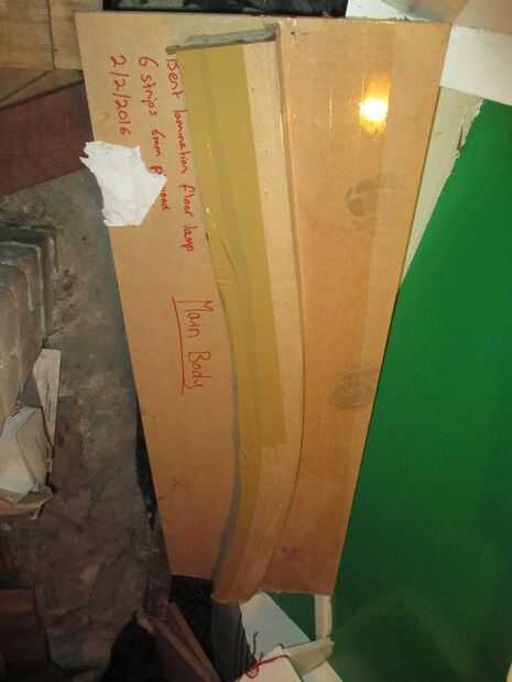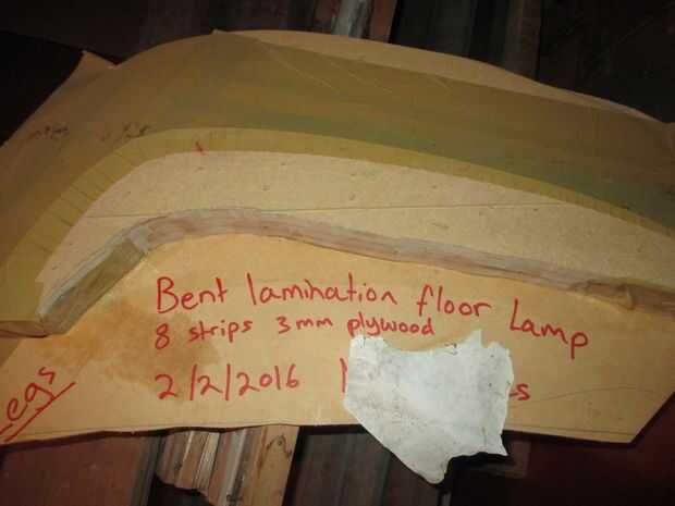 La lámpara es de 1200mm de alto. Marcaron de la curva con una tira fina de madera. Afianzado con abrazadera en un extremo, pude llegar a una curva que me ha gustado. Le animo a experimentar y encontrar una curva que se ve bien a usted. A no hacer demasiado apretado, la madera no será capaz doblar alrededor de él.