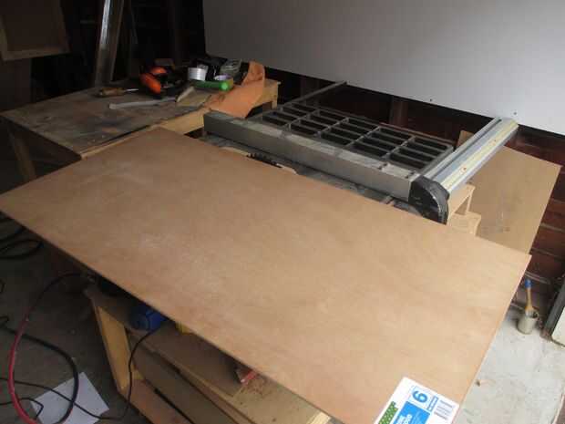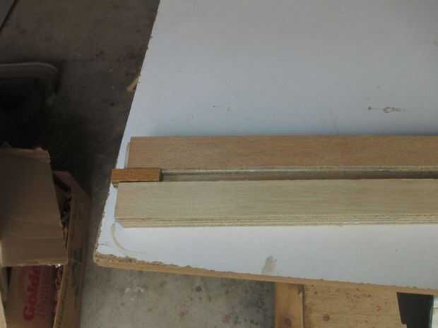 Cortar 4 tiras de la madera contrachapada de 6mm a 62 mm x 1300 mm. Luego 4 tiras de 25 mm x 1300 mm. Usé la Sierra de mesa. También se podría utilizar una sierra circular o incluso una sierra de mano el cuerpo principal está construido con 2 capas completas en la parte inferior, el 4 medio capas siguiente (2 de cada lado) y luego las restantes 2 capas completas en la parte superior. Esto deja una arboleda para el cable de viaje luego la lámpara.