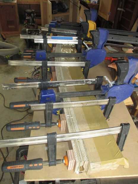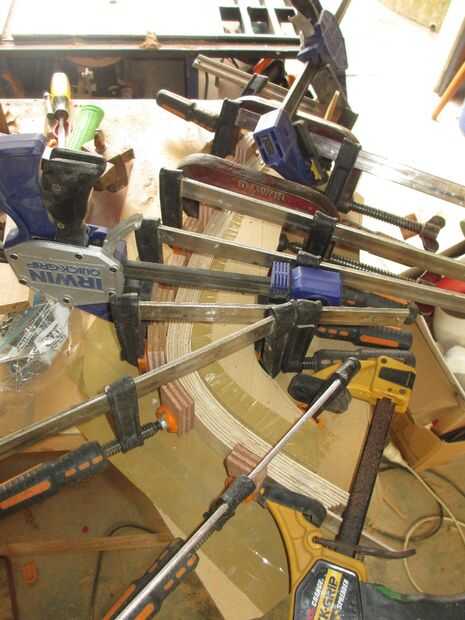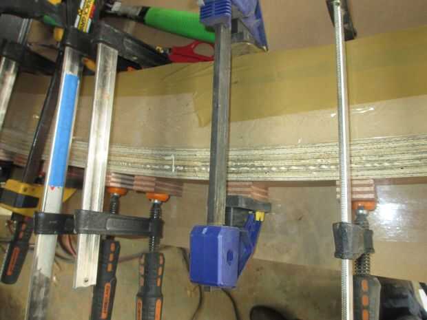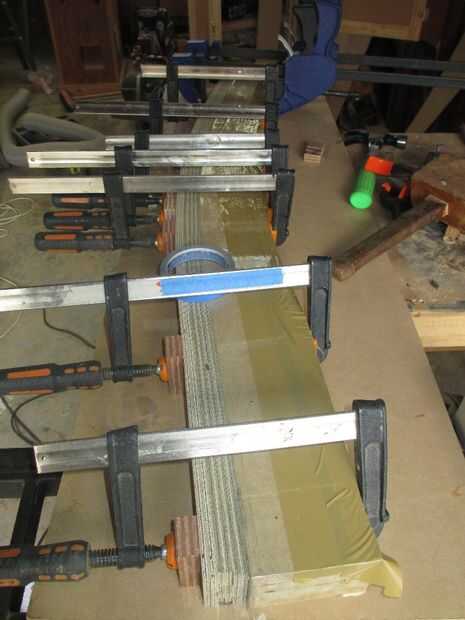 A continuación Unte pegamento en todas las capas y luego fijarlo con la abrazadera en el molde. Alguna vez has escuchado el dicho, "nunca puede tener suficientes abrazaderas"? Este definitivamente applys para láminas dobladas. Sujetar el cuerpo al molde y deje que se seque. Siga las instrucciones en la botella de pegamento para tiempos de secado. Una laminación doblada, usted quiere mucho pegamento apretón hacia fuera. Esto dice que había una buena cantidad de pegamento entre cada capa.